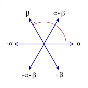 As a first example, consider the six vectors in 2-dimensional Euclidean space, R2, as shown in the image at the right; call them roots. These vectors span the whole space. If you consider the line perpendicular to any root, say β, then the reflection of R2 in that line sends any other root, say α, to another root. Moreover, the root to which it is sent equals α + , where n is an integer (in this case, n equals 1). These six vectors satisfy the following definition, and therefore they form a root system; this one is known as A2.