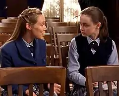 They later spend a summer as roommates during an internship program.[6] When Paris learns that her application to Harvard University has been rejected, Rory is the first person to comfort her.[3] Upon graduating from high school, Rory is elected valedictorian over Paris, and the girls hug before parting ways. They then become roommates at Yale University, supporting one another through a number of issues. During their first spring break, the two share a kiss while bored in a club. This development garnered immediate interest from viewers and the media.[7][8] Rory later feels that they cannot pursue a romantic relationship, however, because Paris is too "high-maintenance" for her.[1] When Rory drops out of school, Paris grows upset and spends a great deal of time with Rory's mother, Lorelai, labeling Rory her best friend.[9] They eventually graduate together, and Rory declares that they will always be a part of each other's lives.[9] In the spin-off miniseries Gilmore Girls: A Year in the Life, which takes place nearly 10 years later, they are shown to still be close to one another.[10]