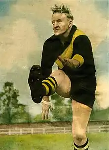 Wright cut a noticeable figure, with his huge frame (188 cm and over 100 kg) and golden blond hair.[3] In the post-war era, all VFL clubs were valiantly scouring the country, looking for big men capable of dominating the rucks and giving their team first use of the ball at ball-ups and boundary throw-ins. The boundary throw-in disappeared from the game after a 1925 rule change, but the rule reverted to its original form during the war, therefore increasing the emphasis on ruck play.[4] The Tigers could see Wright's rare ability but, due to his truncated early career, felt he still needed to learn the subtleties of the game. Besides, in Jack Dyer and Bill Morris, Richmond already possessed the best ruck combination in the competition.