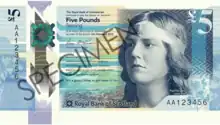From May 2020 RBS began to replace the “Ilay” series with the new “Fabric of Nature” series of polymer banknotes. The first polymer notes, the £5, came into circulation on 27 October 2016.[40] The £5 note features Nan Shepherd on the obverse accompanied by a quote from her book 'The Living Mountain', and the Cairngorms in the background. The reverse shows a pair of mackerel, with an excerpt from the poem ‘The Choice’ by Sorley MacLean.[41]
