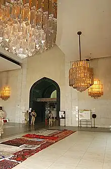 A tile mosaic depicting U.S. President George H. W. Bush was installed on the floor of the lobby after the Gulf War. This was intended to force any visitors to walk over his face to enter the hotel (a serious insult in Arab culture). On 17 January 1993, the hotel was damaged in a U.S. missile strike and the attack resulted in civilian casualties.[1] The artist, Layla Al-Attar, who did the mosaic died along with her husband and housekeeper when another stray U.S. missile hit her house. After the invasion in 2003, the mosaic was smashed by U.S. soldiers, who left a portrait of Saddam behind.[2]