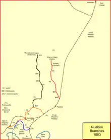 The GWR later obtained authorisation to construct a branch line (the "Rhos" branch) from a junction south of Wrexham to Legacy, making new connections there with the Ponkey branch and the Plas Madoc branch.[15] This new group of branches opened on 1 October 1901.[13][14]