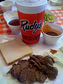 Rudy's Country Store and Bar-B-Q is a barbecue restaurant established in Leon Springs, a district of San Antonio in the U.S. state of Texas in 1989.[1] The company operates restaurants in Texas, Arizona, Oklahoma, New Mexico, Colorado, and Florida and sells products online.