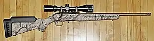 • Stainless: New addition to the lineup in 2017, the Stainless models are similar in appearance to the OD Green models with factory Weaver rail and a threaded 18" 416 stainless steel barrel with no iron sights, but has a black synthetic stock and also comes in .17 HMR (Model 8353)[4] in addition to .22 LR (Model 8351)[5] and .22 WMR (Model 8352).[6] Furthermore, in October 2017 TALO Distributors introduced a special production run of stainless version Wood Stock models in .22 LR (Model 8359)[7] and later in .22 WMR (Model 8364) and .17 HMR (Model 8365) that come fitted with an engraved walnut stock, 22 in (560 mm) barrel and open iron sights in addition to the receiver being drilled and tapped for scope bases.