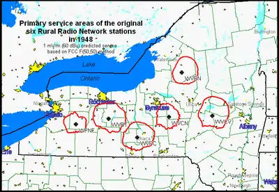 The Rural Radio Network (RRN) was an interconnected group of six commercial FM radio stations spread across upstate New York and operated from Ithaca, New York -- the first all-radio, no-wireline network in the world.[1] It began operation in 1948 as an innovative broadcast service to the agricultural community, but competition from television—and a lack of affordable, well-performing FM receivers—caused the founders' original business plan to fail. The stations changed ownership, as well as Radio formats, several times in futile attempts to achieve profitability. Perhaps the group's most notable owner was the Christian Broadcasting Network, headed by televangelist Pat Robertson, which acquired the stations through a corporate donation in 1969. A decade later, Robertson decided to sell the stations and the licenses were gradually transferred to individual owners in 1981 and 1982, thus dissolving one of the nation's earliest FM networks.