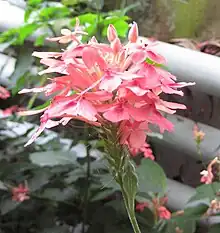 A genus of shrubby herbs or shrubs.[2][3][4] The leaves are arranged opposite,[3][5] they have visible linear cystoliths.[2] The flowers are in spikes or panicles,[3] or in 3-7-flowered,[5] cymules aggregated into long raceme-like cymes.[2] The flower has bracts and bracteoles (small bracts) that are narrow and inconspicuous.[3] The flower calyx is deeply 5-lobed,[2][3][4] with narrow,[3] or linear-lanceolate or filiform (thread-like) shaped lobes.[2] Sometimes with thread-like tips.[3] The corolla-tube is narrowly cylindrical,[3] and long and linear.[2][4] it is divided into 5 subequal lobes,[3] which are spreading or reflexed.[2] The corolla (petals of the flower) are usually red, but may be salmon-pink, scarlet or orange-red. They are also hairy and sometimes glandular, on the outside.[2] It has 2 stamens which are just exserted (projected beyond the corolla-tube).[2][3] They have anthers which are 1-celled. The ovary is 2-celled with 2 ovules in each cell or loculus.[2][3] Meaning it has 2-4-seeds. It has a filiform (thread-like) shaped style.[3] The fruit or seed capsule is club-shaped,[3] with solid stalk-like basal part.[2] Inside the capsule, the seeds are smooth and glabrous or variously ornamented.[3] They are situated on prominent hook-shaped retinaculas (thick fibres), without hygroscopic hairs.[2]