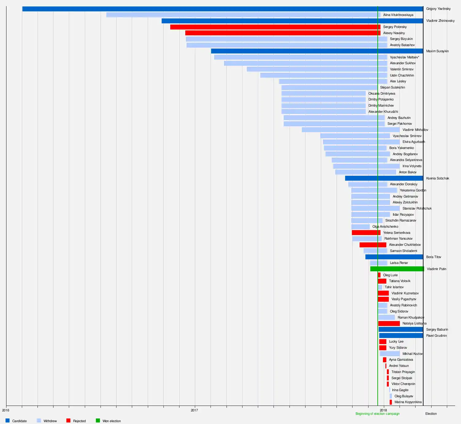 Independent | None | Navalny announced his candidacy and the start of his campaign on 13 December 2016. His eligibility was put into question by his five-year suspended sentence for accused embezzlement of timber from the company Kirovles. The Russian Supreme Court overturned his sentence in November 2016 after the European Court of Human Rights determined that Navalny's rights were violated and sent it back to a district court in the city of Kirov for review.[82] However, in February 2017, a district court in Kirov upheld his suspended sentence for embezzlement which could prevent him from running.[83] According to his chief of staff, he decided to begin his campaign early to raise support for his candidacy so that the government could not deny him access to the ballot and that Navalny will continue to campaign regardless of the ruling.[84] Throughout the early months of 2017 he traveled to many cities, where he set up campaign offices.[85] Representatives of the CEC commented on several occasions that Navalny will not be able to run due to his conviction in the Kirovles case. On 24 December 2017, groups of voters met in twenty Russian cities to put Navalny forward as a candidate.[86] He filed registration documents with the CEC on the same day.[87] Navalny's bid was rejected by the CEC on 25 December because of a past criminal conviction.[88] Soon after the news broke, Navalny called on his supporters to boycott the elections.[89] | ||