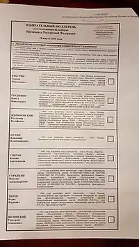 - ↑ ЦИК отказал в праве участвовать в выборах кандидату от "Рот фронта" Лисицыной. ТАСС (in Russian). Retrieved 2017-12-26.