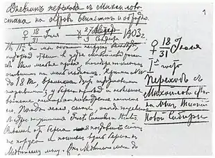 On 26 July the expedition met Sergei Tolstov, a sailor from the 1900–1902 expedition who was left on Faddeyevsky Peninsula to wait for Toll, whose traces were not found anywhere.[10] Further on Cape Vysoky they met Brusnev, who was also left by the previous expedition to assist Toll, and rested at his camp for a day.[10] From Cape Vysoky, the team traveled through open waters, using sail and oars,[11] and on 4 August reached the Bennett Island. There, on Cape Emma, Kolchak found a bottle with a note from Toll and map of the island.[12]