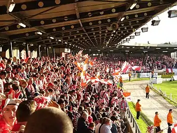 Derry City's first game at the Brandywell was against Glentoran on 22 August 1929. The stadium has played host to many notable matches, such as Derry City's 1–0 victory IFK Göteborg on 27 July 2006 in the UEFA Cup first qualifying round.[4] However, current facilities for spectators and media simply cannot cope with the demand for some matches. The ground also hosted the FAI League Cup final in 2006 between Derry City and Dublin rivals, Shelbourne FC. Derry won the dramatic game after it went to a penalty shoot-out.[5]