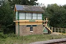 Several SER stations were retrofitted with signals on the line in the early 1890s.[19] The box at Rye was built in 1894 using a Saxby & Farmer Type 12 design. It retains its original 1888 pattern Duplex frame, though the original 30-lever manual signals were replaced by coloured lights on 1 October 1979.[19][20] The ground floor is constructed of Flemish bond brown brick, the first floor is made of timber with weatherboard cladding and it has a slate roof. The signal box was Grade II listed in 2013 as it is one of only two of its type still standing in good condition.[19] In 2019, it was repainted and refurbished.[21]