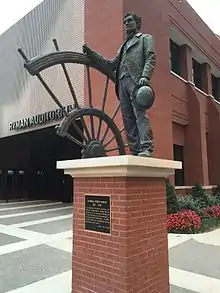 However, Roy Acuff, an Opry stalwart and a major stakeholder of Opryland USA, reportedly said, "I never want another note of music played in that building." He led the unsuccessful charge to tear down the Ryman.[18] Acuff, a staunch supporter of moving the Opry to a modern home, told The Washington Post in 1974, "Most of my memories of the Ryman auditorium are of misery, sweating out here on this stage, the audience suffering too... We've been shackled all of my career."[17] Acuff notably hated the dressing room situation at the Ryman so much that he bought a nearby building just to have a bigger one.[17] A life-sized statue of Acuff (alongside one of Sarah Cannon as Minnie Pearl) has been installed in the lobby of the preserved Ryman Auditorium.