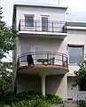 While traditional villas and cottages still dominated house production in the early 1930s, a few exclusive villas were built in the new Functionalist style, inspired by the showcases at the Stockholm International Exhibition 1930. One of the earliest examples is the villa architect Sven Markelius, one of the leader of the exhibition, had built for himself at Nockeby 1930–31. Its strict geometry, its bright plaster façades, and its elevated location with nature left untouched around the building makes it characteristic of villas in Bromma.[1]