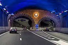 Södra länken (The southern link), designated as national road 75 (Swedish: Riksväg 75), is a motorway in Sweden connecting Essingeleden (E4, E20), Stockholm with Värmdöleden (county road 222), Nacka. Södra länken is 6 km (3.7 mi) in length, of which 4.5 km (2.8 mi) is in tunnels.[1] This makes it the third longest urban motorway tunnel in Europe after Madrid M30 orbital motorway and Blanka tunnel complex in Prague at 5.5 km (3.4 mi). The tunnel is 4 lanes wide each way at its widest point (total 8 lanes).
