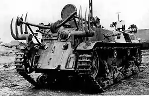 During the 1930s, the Imperial Japanese Army required a specialised vehicle in preparation for war against the Soviet Union, which would be capable of destroying Soviet fortified positions along the Manchurian border.[2] During the development and planning, it was decided that its capabilities should include trench digging, mine clearing, barbed wire cutting, mass decontamination, chemical weapons employment, use as a crane vehicle, as a flamethrower tank, and as a bridgelayer.[2][5]