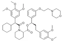 SAFit2 is a drug which acts as a potent and selective inhibitor of the signalling factor FK506 binding protein 51 (FKBP51), which is involved in the downstream response to glucocorticoid release in the body.[1] Since elevated glucocorticoid levels are a characteristic marker of chronic stress, blocking glucocorticoid signalling pathways using SAFit2 has been shown to counteract many of the associated symptoms such as obesity,[2][3] chronic pain,[4][5] depression and anxiety,[6][7] and addiction.[8][9] While SAFit2 itself is a relatively large molecule and is unlikely to have suitable properties to be developed for medical use, it has demonstrated that inhibition of FKBP51 may be a useful therapeutic approach for alleviating consequences of long-term chronic stress and pain.