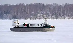 The SAH 2200 is a compact military hovercraft. It has the capacity to transport a maximum of 12 fully-equipped troops, 23 passengers, or alternatively a payload of up to 2.2 tons.[1] The vehicle is typically armed with a single 12.7mm machine gun. Both propulsion and auxiliary power is supplied by a single Cummins 6CTA-8-3M-1 diesel engine, rated at 190bhp at 2,500rpm.[1] Power from the engine is delivered via a toothed belt to the vehicle's single 1.5m diameter propeller, which is positioned within a duct above the after part of the deck. Dependent upon customer preference, the deck area can be left completely open, covered by a half-canopy, or placed entirely within a cabin.[1]