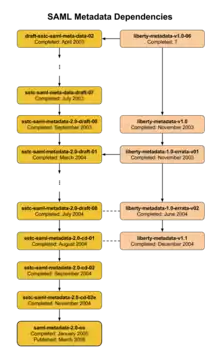 - ↑ J. Moreh et al. (editors). Metadata for SAML 1.1 Web Browser Profiles. Working Draft 07, 23 July 2003. Document ID sstc-saml-meta-data-draft-07. https://www.oasis-open.org/committees/download.php/3002/draft-sstc-saml-meta-data-07.doc (https://drive.google.com/file/d/0B7vociYknAbCRUJ6UzNuTnNiOW8/view?usp=sharing)