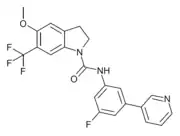 • COC1=C(C=C2C(=C1)CCN2C(=O)NC3=CC(=CC(=C3)C4=CN=CC=C4)F)C(F)(F)F