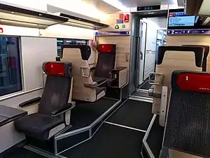 The low-floor entrances allow step-free access from platforms at heights between 550 mm (22 in) and 760 mm (30 in) and several accessible toilets and areas for wheelchairs are available, allowing the train to comply with the Law on Equal Rights for Persons with Disabilities.[21] As a long-distance train, it also features signal boosters for 3G/4G cellular phone networks, power sockets (for Swiss and international plugs) and large luggage racks for passenger comfort, along with energy-efficient lighting. The interior is flexible, meaning it can be extensively refitted and modified to an operator's requirements.[20]