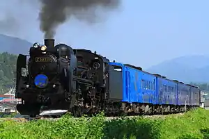 The SL Ginga (SL銀河) was a steam-hauled "Joyful Train" (excursion train) operated by East Japan Railway Company (JR East) primarily on the Kamaishi Line in the north-east Tohoku Region of Japan from April 2014 to June 2023.[1] The train consisted of restored JNR Class C58 steam locomotive number C58 239 together with four rebuilt former KiHa 141 series diesel cars purchased from JR Hokkaido (themselves rebuilt from earlier 50 series passenger coaches and made surplus to requirements following the electrification of the Sasshō Line in 2012).[2] The diesel cars provided additional power to cope with the line's gradients.[2]
