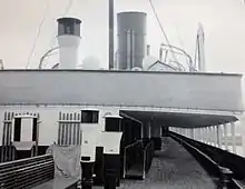 A powerful steam windlass was situated forward on the shelter deck for working the anchors, which were arranged to be stowed in hawse pipes, and two large capstans were fitted aft on the shelter deck for warping purposes.[4] A combined steam and hand steering engine was also located aft, and this was controlled by a telemotor gear from the navigating bridge.[4] There was also a powerful steering gear situated forward, the purpose of which was to operate a bow rudder so as to facilitate the quick turning and manoeuvring of the vessel when entering or leaving port.[4] For the stern rudder there was a combined steam and hand gear.