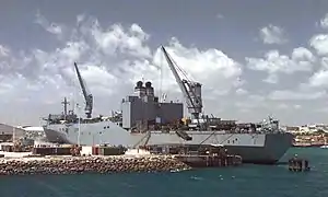 USNS Capella (T-AKR-293) offloading military vehicles and supplies in the port of Mogadishu in support of Operation Restore Hope.