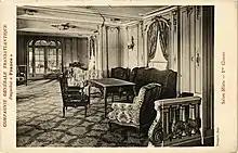 Her first class accommodations were graced with various portraits of Louis XIV as well as his relations. France was also credited for bringing the grand staircase to the ocean liner, a fashion which prevails in modern cruise ships. Her First Class entrance hall and dining room demonstrated this.[6] The staircase in the dining room was in fact copied from the Parisian Hôtel de Toulouse.[3] Further unique points included her Cafe Terrasse and the Salon Mauresque, the latter a reference to the French colonial empire in Africa. The ship also had a gymnasium, an elevator, and a hair salon, all great novelties at the time.[4] Style Louis seize (Louis XVI) was also used within the private apartments of the grand luxe suites on board. According to a 1912 booklet publicising the liner, her second class accommodation was credited as "match[ing] the richness and comfort of first class on the old liners."[4] Passengers in this class could also utilise a hair dressing salon.[4] Third and steerage classes were also praised as being well-appointed.