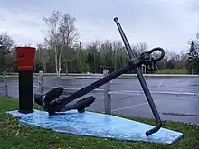 The schooner-barge Michigan was never seen again after the night of 2 October 1901.[1] The wreck of Drake was first discovered by Captain Campbell of Liberty just four days after she sank on 6 October 1901, when he was downbound for the Soo Locks. Captain Campbell reported that Drake was located between Vermilion Point and Whitefish Point lying on her side in 40 feet (12 m) of water with about 5 feet (1.5 m) feet of water over her with a floating spar still strung to the hull.[1] The wreck of Drake lay forgotten on the bottom of Lake Superior for 77 years until she was rediscovered at 46°46.588′N 85°05.933′W / 46.776467°N 85.098883°W in 1978, by the Great Lakes Shipwreck Historical Society (GLSHS)[6] who subsequently illegally removed her rudder, windlass, anchor, and a sign board in the 1980s. Michigan’s Antiquities Act of 1980 prohibited the removal of artifacts from shipwrecks on the Great Lakes bottomlands. The Evening News reported a Michigan Department of Natural Resources and Environment 1992 raid on the Great Lakes Shipwreck Museum and its offices that found evidence of 150 artifacts illegally removed from the state-claimed bottomlands, including artifacts from Drake.[7][8][9] Following a settlement agreement with the GLSHS, Drake's rudder, anchor, and windlass are now the property of the State of Michigan.[8][9] The rudder is on loan to the GLSHS for display nearby the Great Lakes Shipwreck Museum and the anchor and windlass is on loan to Whitefish Township for display next to its community building.