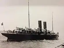 On 9 April 1917, a German submarine had penetrated to within a few miles of Liverpool and succeeded in torpedoing the American liner SS City of New York. The Tynwald, inward bound from Douglas, was just passing the Bar Light Ship[6] and was quickly on the scene. The weather at the time was far from good, a strong wind blowing with showers of snow at intervals. The passengers were conveyed in the liner's own lifeboats, which came alongside the Tynwald, and, although the sea was distinctly lumpy, causing a considerable rise and fall of the lifeboats, all were safely taken on board, including Admiral Sims of the U.S. Navy.[6]