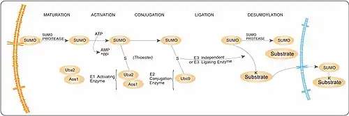 SUMO enzymatic cascade catalyzes the dynamic posttranslational modification process of sumoylation (i.e. transfer of SUMO protein to other proteins). The Small Ubiquitin-related Modifier, SUMO-1,[1][2] is a ubiquitin-like family member that is conjugated to its substrates through three discrete enzymatic steps (see the figure on the right): activation, involving the E1 enzyme (SAE1/SAE2);[3] conjugation, involving the E2 enzyme (UBE2I);[4][5] substrate modification, through the cooperation of the E2 and E3[6] protein ligases.[7]