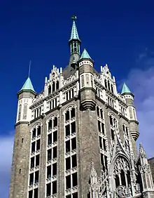 Though the building is in the Gothic architectural style the building sports several touches that tie the building into the Dutch heritage of Albany. The central tower sports an 8-foot-tall (2.4 m) weathervane that is in the shape of Henry Hudson's ship the Half Moon while the gables of the entire building bear the coat-of-arms of prominent Dutch families including that of Albany's first mayor, Pieter Schuyler.[10] Other non-gothic elements include the names and dates of prominent printers on the Albany Evening Journal building, including William Caxton 1487, the father of English printing.[11]
