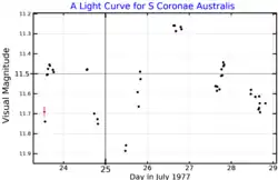 ![]() A visual band light curve for S Coronae Australis, adapted from Mundt (1979).[1] The error bar shown on the left-most point applies to all points. | |