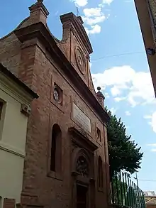 The façade is made of brick with late-Baroque decoration. The interiors were frescoed by Fontana, who also painted the main altarpiece depicting The Apparition of the Holy Heart to Santa Maria Alacoque. In the right wall is a large canvas depicting Madonna between Saints Nicola and Benedetto (18th century) and on the left wall a canvas depicting Santa Giacinta Marescalchi by Gerolamo Capoferri.[2]