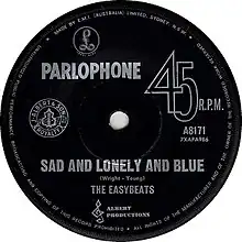 "Sad and Lonely and Blue" was released as the Easybeats fourth single on 4 November 1965, backed by "Easy As Can Be", a song boasting influences from both rhythm and blues and folk rock.[11] Released through Albert Productions and distributed by Parlophone, the single was what Young described as "sort of a bomb for us".[12] At the time of the single's release, Australia did not have a unified national record chart and instead, every major Australian city had their own chart, which meant that airplay of the single was never concentrated across the whole country at the same time.[13] In the estimations of David Kent's retrospective Kent Music Report, the song only reached number 21 nationally, as opposed to both "She's So Fine" and "Wedding Ring" which were top-10 singles.[13]