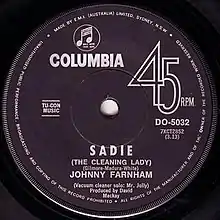 "Sadie (The Cleaning Lady)" was Australian pop singer Johnny Farnham's first solo single.[1] The novelty song was released in November 1967 and was No. 1 on the Go-Set National Singles Charts for five weeks in early 1968[2][3] (six weeks on the Australian charts in 1968 based on the Kent Music Report).[4] It was the largest-selling single in Australia by an Australian artist in the 1960s.[1][5]