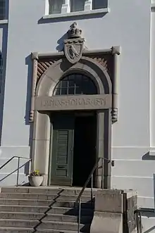 Safnahúsið was constructed in 1906–08 to a design by the Danish architect Johannes Magdahl Nielsen, to house the National Library (now combined with the library of the University of Iceland to form the National and University Library of Iceland) and the National Archives. The façade is decorated with crests bearing the names of literary figures.[1] It was originally to be built of dolerite, like the parliament house, and to have a copper roof, but this was judged to be too expensive so the building was instead constructed of concrete with an iron roof.[2] It was at the time one of the largest and finest buildings in the country.[3]