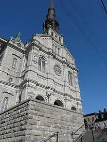 The original structure was completed in 1847, but a disastrous fire that leveled much of the city in 1881 destroyed it completely. The current church was built in 1884 out of seven types of Italian marble. Designed by architect Joseph-Ferdinand Peachy in the Second Empire style, the church was inspired by the facade of the Église de la Sainte-Trinité in Paris. It features a 240 ft (73 m) spire, 36 stained-glass windows, and dozens of statues and paintings, among other ornate decorations. The Gagnon brothers were both organists at the church; Ernest Gagnon from 1853 to 1864 and Gustave Gagnon from 1864 to 1876.[1] The Archdiocese of Quebec closed this church on Pentecost of 2015.[2]