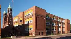 The former Saint Bernard's High School with the Church of Saint Bernard in the background