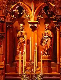 The High Altar's base features a triptych of two Old Testament events laying foundations for Christ's priesthood. They flank a third central panel depicting the Last Supper at which Christ instituted the Holy Eucharist. The Old Testament carvings both concern Abraham: The Binding of Isaac Upon an Altar to God, Genesis 22:1-24 (left side) and the Blessing of Abraham by the High Priest Melchizedek of Salem Following the Battle of the Kings, Genesis 14:17-20 (right side). The Last Supper, John 13-21 (center), was carved from a print of the mural by Leonardo da Vinci for dining room wall of the monastery Santa Maria delle Grazie (Milan, Italy). Between the triptych's three panel carvings, the Swiss woodcarvers made an artistic pun, using as pillars supporting the Altar itself three Church fathers–Peter (Rome ), John (Antioch) and James (Jerusalem) – identified by a fourth Apostle, the roving Paul as “pillars” of the Church. See Galatians 2:9. Peter holds the keys to Church; Paul holds the decapitating sword; John carries the New Testament to which he contributed; and James is supported by the cudgel of his martyrdom.