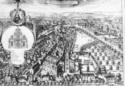 The previous church was a Gothic building with three naves and a transept that was destroyed by Calvinists in 1584 during the Calvinist Republic of Brussels, which lasted from 1577 to 1585.[6][7] The beguines decided to rebuild their church in Baroque style and its construction started in 1657. Attributed to the Flemish architect Lucas Faydherbe,[8] this church is a notable illustration of the Italian-influenced Brabantine Baroque style of the 17th century. Its facade is considered to be one of the most beautiful in Belgium. The church was restored after a fire ravaged the roof in November 2000.[9]