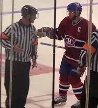 Koivu being escorted to the penalty box by two referees during his career with the Montreal Canadiens.