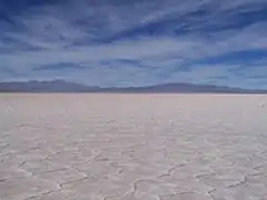 The Salinas Grandes are located in the north in the provinces of Jujuy and Salta (in Argentina), at an average altitude of 3,450 meters (11,320 feet) above sea level. It covers an area of 212 km2 (82 sq mi) and is well-known for its vast white desert.[1] The desert is about 320 km (200 mi) long.