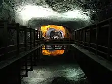 The halite mines were exploited already by the pre-Columbian Muisca culture since the 5th century BC.[9] being one of their most important economic activities.[7][10] The traditional halite mining was described by Alexander von Humboldt during his visit to Zipaquira in 1801.[11] He depicts this deposit as bigger than the main halite mines of the time, such as those in Spain, Switzerland, Poland and the County of Tyrol with a calculated resource estimation of one million cubic meters. Von Humboldt also criticized the excavation techniques as being unpractical for future exploitation, recommending drift mining instead, since the halite tunnels don't require beams, lowering the costs.[11]