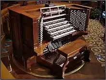 The Tabernacle organ is considered to be one of the finest examples of the American Classic style of organ building.[4][5] The casework was inspired by the design of the Boston Music Hall organ (which is now housed, since 1909, at the Methuen Memorial Music Hall), the original organ was built in 1863-1867 by an Englishman, Joseph Ridges. Ridges' instrument contained some 700 pipes and was constructed of locally derived materials as much as possible. This original modest 2 manual organ had its console attached to the lower central part of the case and its action was tracker. The organ was later rebuilt and enlarged first by Niels Johnson (1889), the Kimball company of Chicago (1901), the Austin company of Hartford (1915, 1926 & 1937) and finally by the Aeolian-Skinner organ company of Boston (1948). The organ today is largely the result of the personal involvement of noted Anglo-American organ builder G. Donald Harrison, president of the Aeolian-Skinner organ firm when the tabernacle organ was installed. His collaboration with legendary Tabernacle organist Alexander Schreiner produced this masterwork of American eclectic organ building.