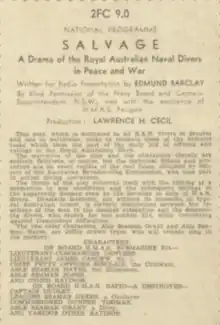 Salvage is a 1936 Australian radio play by Edmund Barclay about the rescue of a submarine.[1] It was called "one of the most ambitious attempts at dramatic realism ever attempted by the Sydney production department of tire Broadcasting Commission."[2]