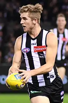 After spending two seasons with Sydney without playing a senior AFL match, he was traded to Collingwood during the 2017 trade period.[2] He made his debut in the thirty-four point loss to Hawthorn at the Melbourne Cricket Ground in the opening round of the 2018 season.[3] In round 3, he was nominated for the 2018 AFL Rising Star award.[4]