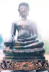 Buddha statue: "Phra Phutthamani Maitri Rattana" (Thai: พระพุทธมณีไมตรีรัตนะ, "the jewel Buddha of precious friendship"). Formerly, it was untitled but called "Phra Phuttharup Chiang Saen Sing Sam" (th: พระพุทธรูปเชียงแสนสิงห์ 3, "Chiang Saen's Three Lions Buddhist Statue). On 1 July 2004, Somdet Phra Nyanasamvara, the Supreme Patriarch of Thailand) gave it its present name to celebrate the school's centenary in 2008. The statue is bronze, dating back around 400–500 years to the Chiang Saen period. Having a size identical to a mature child sitting in a meditative posture, its length is 17 inches. Three lions mentioned in the name are the artistic features of the statue: lion-like feature, divine-like feature, and Buddha-like feature.[7] Presently, it is installed in Building 1's auditorium as the principal Buddha statue.