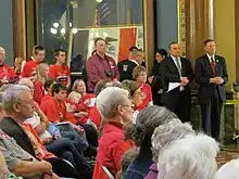 An amendment was first proposed in 2008 but did not pass.[5] The Assembly did not vote on a constitutional amendment in 2009, and Senate Majority Leader Michael Gronstal said he would not allow one to be brought to the floor in 2010.[23] In a joint press release with House Speaker Pat Murphy on April 3, 2009, Gronstal welcomed the court's decision, saying, "When all is said and done, we believe the only lasting question about today's events will be why it took us so long. It is a tough question to answer because treating everyone fairly is really a matter of Iowa common sense and Iowa common decency. Iowa has always been a leader in the area of civil rights."[24] Democratic leaders of the Iowa Senate and the Iowa House of Representatives during the 2009–2010 legislative session opposed a vote on an amendment.[25] In the next session, debate on a proposed constitutional amendment to ban same-sex marriage in Iowa attracted national news coverage after Zach Wahls, a college student and son of a lesbian couple, addressed the House Judiciary Committee in a public hearing on January 31, 2011.[26] A video of his testimony posted on YouTube went viral.[27] On February 1, 2011, with Republicans in the majority, the House passed House Joint Resolution 6 by a vote of 62–37. Democratic leaders promised to block debate in the Senate, which they did.[28]