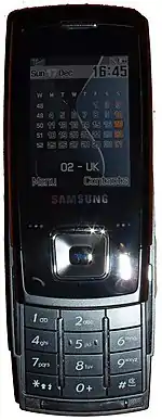 The Samsung E900, introduced in 2006, is a high-end mobile phone and is derived from Samsung's D500-D600-D800 series of slide phones. It is of a slide-up design and has touch-sensitive keys, similar to the LG Chocolate (KG800). It was one of the most popular phones at the time but was discontinued late 2007 when buyers then turned their attention to the Samsung D900i, followed by the Samsung U600, which was the slimmest phone by Samsung with a thickness of 1.09 cm (0.43 in) until the E840 was released.